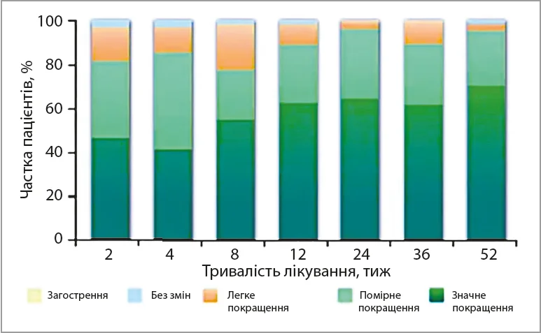 Вже через 2 тиж після початку терапії більшість учасників спостерігали значне полегшення – симптоми зменшилися в >80% хворих. Згодом (упродовж тижнів) позитивна динаміка лише посилювалася: на 12-му тижні полегшення зафіксували майже 89% пацієнтів, а на 24-му – цей показник сягнув 96%. Важливо, що навіть при довготривалому застосуванні (через рік від початку лікування) стійке поліпшення зберігалося в >95% пацієнтів.