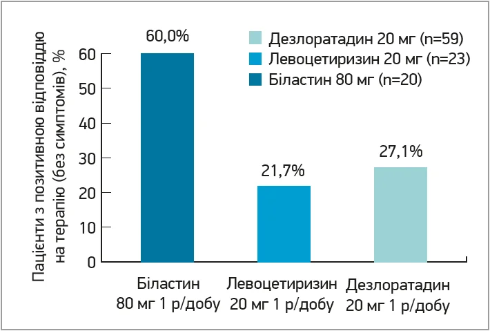 На окрему увагу заслуговують дані щодо ефективності біластину при використанні в підвищених дозах у пацієнтів із неконтрольованою ХК. У межах дослідження Sánchez-Borges і співавт., результати якого відображені на рисунку 5, порівнювали результати ескалації доз біластину, левоцетиризину та дезлоратадину в пацієнтів із ХК (Sánchez-Borges і співавт., 2014). Виявилося, що при застосуванні біластину в дозі 80 мг/добу в 60% пацієнтів симптоми повністю зникали, тоді як для левоцетиризину цей показник становив 21,7%, а для дезлоратадину – 27,1%.