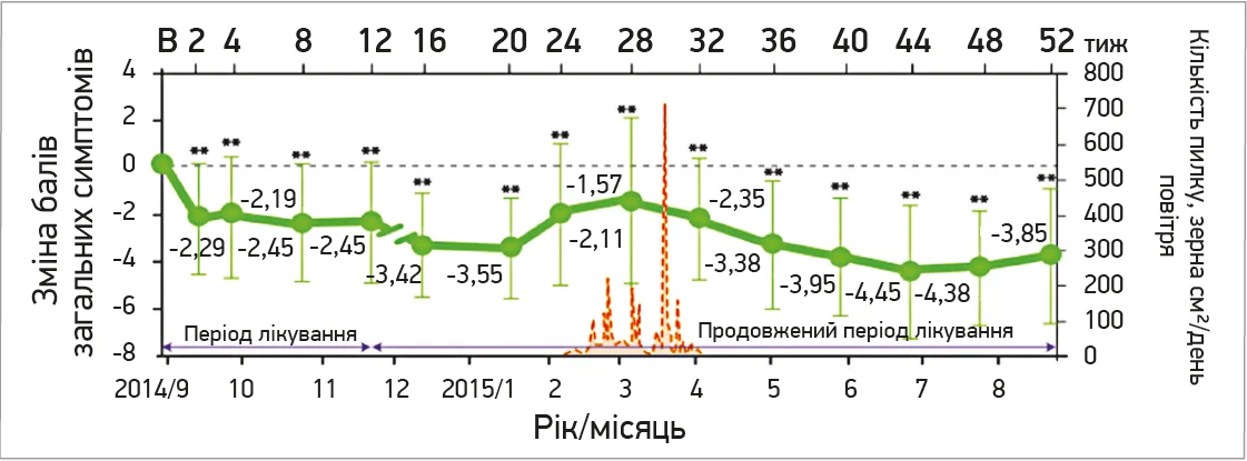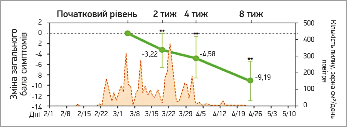 Як показано на рисунку 6, у пацієнтів із сезонним АР уже через декілька тижнів спостерігалося виражене зниження загального бала назальних і очних симптомів, що продовжувало зростати до кінця періоду лікування (-9,19 бала).