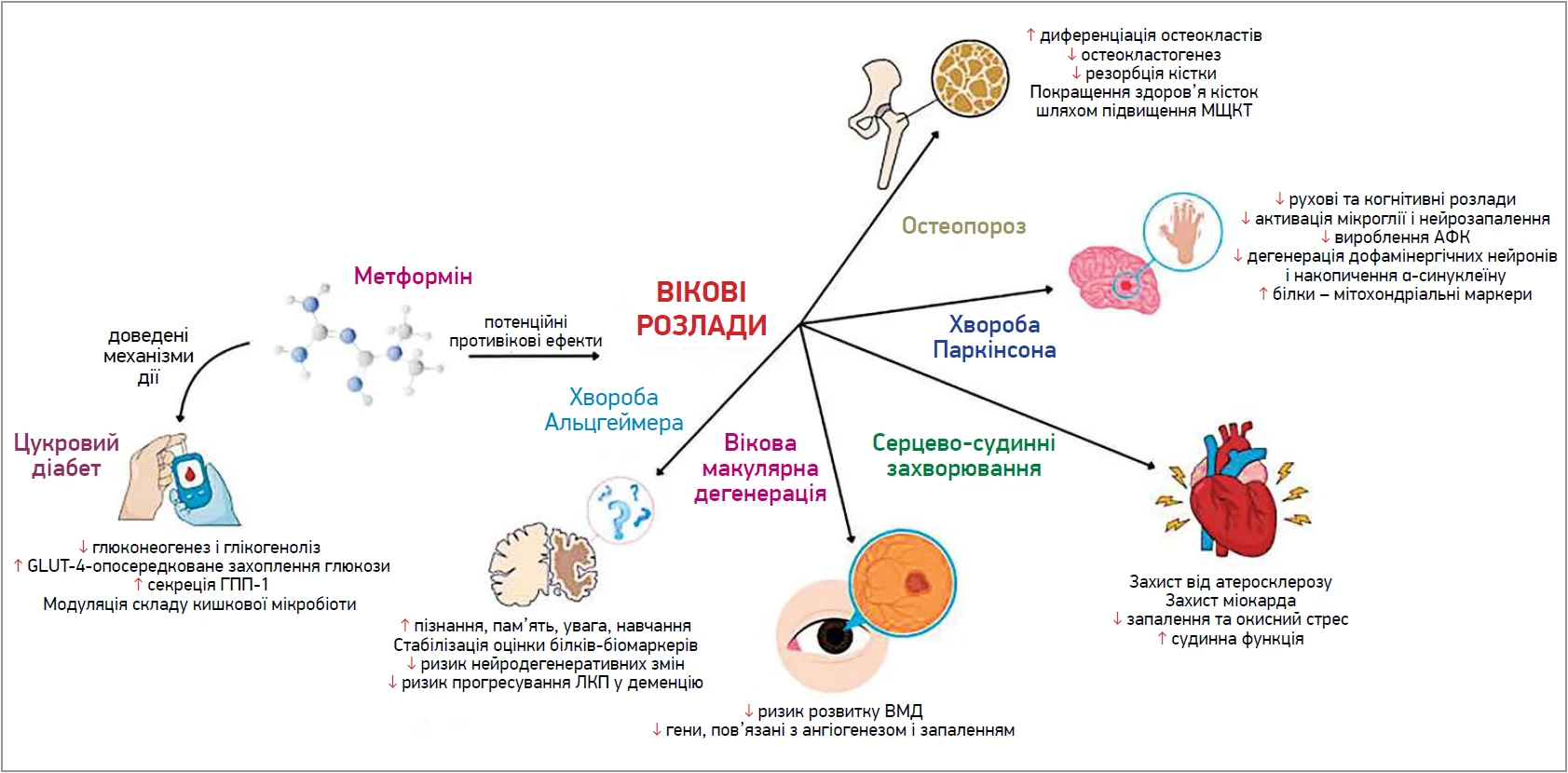 Рис. Потенційні захисні ефекти метформіну проти захворювань, пов’язаних зі старінням