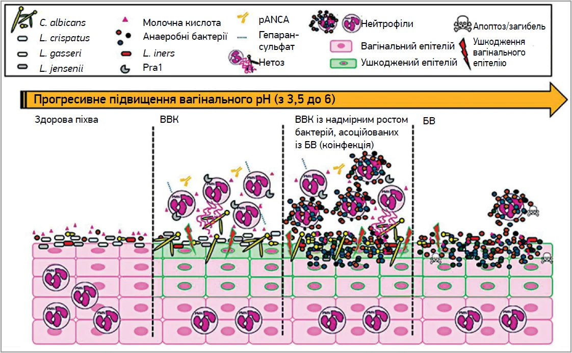 На відміну від ВВК, що зазвичай зумовлений одним патогеном – грибком Candida, БВ є проявом глибокого полімікробного дисбіозу зі зникненням лактобацил і масивним зростанням анаеробної флори (Sobel & Vempati, 2024). При ВВК зміни мікробіому спричиняють виражену прозапальну відповідь епітелію піхви, зумовлену поверхневим ураженням та інвазією грибка. У разі коінфекцій, де поєднуються ВВК і БВ, ця відповідь посилюється – внаслідок одночасного запалення та глибокого дисбіозу, що підсилює симптоматику й перебіг (Sobel & Vempati, 2024).