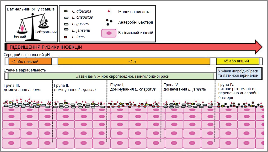 Піхва людини – унікальне середовище серед ссавців, з виразною мікробною екосистемою, в якій домінують лактобацили. На їхню частку припадає приблизно 80% усієї мікрофлори (Pramanick et al., 2019). Водночас піхвовий pH зберігається в кислому діапазоні 3,5-5 – це одна з ключових відмінностей жіночого репродуктивного тракту людини від інших видів (Miller et al., 2016; Pramanick et al., 2019) (рис. 2).