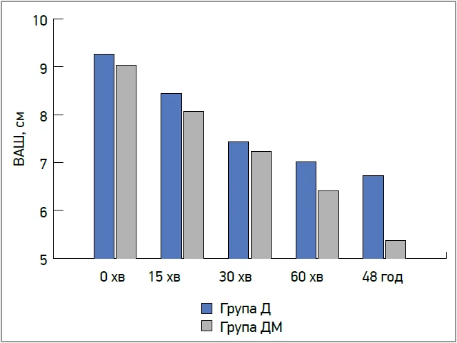 На момент залучення в дослідження (0 хв) пацієнти обох груп мали високий рівень болю. Початкова середня оцінка за ВАШ становила 8,12±1,59 см у групі Д та 7,49±1,81 см у групі ДМ, при цьому біль був достовірно вираженішим у групі Д (p=0,032).