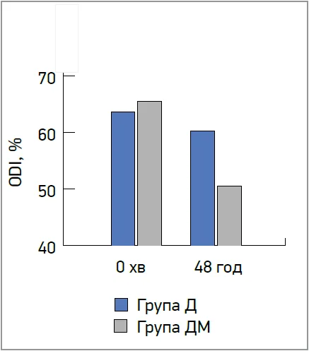 ODI оцінювали на момент надходження та через 48 год після терапії. Початкові значення були дещо вищими в групі ДМ (43,95±22,09 проти 39,87±20,51 у групі Д), проте ця різниця не була статистично значущою (p=0,514).