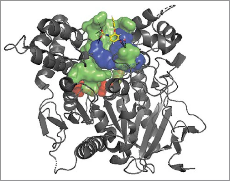 Рис. Тривимірне зображення (комп’ютерна модель) активного центру АХЕ в комплексі з німесулідом (адаптовано з Roggero A. et al., 2025) [1]