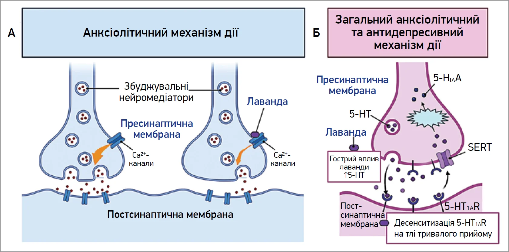 Доведено, що лаванда модулює нейрональну збудливість, впливаючи на потенціалозалежні кальцієві канали [9, 10]. Підвищена збудливість, котра є характерною ознакою тривожних станів, асоційована з надмірним входом іонів кальцію до пресинаптичних закінчень. Лаванда пригнічує активність декількох типів кальцієвих каналів (переважно Т- і N-типу, частково – P/Q-типу). Це зумовлює зменшення вивільнення збуджувальних нейромедіаторів (глутамат, субстанція Р), стабілізацію нейрональної активності, зменшення тривожності (рис. 1) [9].