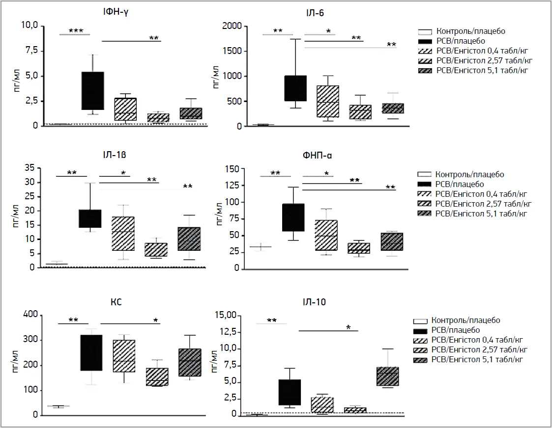 Схожі дані отримано в іншій експериментальній роботі. Встановлено, що інфікування мишей РСВ супроводжується достовірним зростанням концентрацій прозапальних медіаторів у рідині, отриманій під час бронхоальвеолярного лаважу, зокрема ІФН-γ, ІЛ‑6, IЛ‑1β, ІЛ‑10, фактора некрозу пухлини (ФНП)-α та кератиноцит-асоційованого хемокіну (KC). Додавання Енгістолу асоціювалося зі зниженням вірус-індукованої цитокінової відповіді: зафіксовано дозозалежне зменшення рівнів IФН-γ, IЛ‑6, IЛ‑1β, ФНП-α та KC порівняно з контролем (рис.) [3]. Крім того, Енгістол сприяв збільшенню кількості фагоцитуючих альвеолярних макрофагів і підвищенню їхньої функціональної активності, особливо на ранньому етапі інфекції [3]. Виявлені властивості свідчать, що Енгістол здатний обмежувати запальну реакцію в дихальних шляхах і збільшувати кількість клітин, що відіграють ключову роль у кліренсі вірусних частинок, клітинного детриту та вторинної бактеріальної флори.