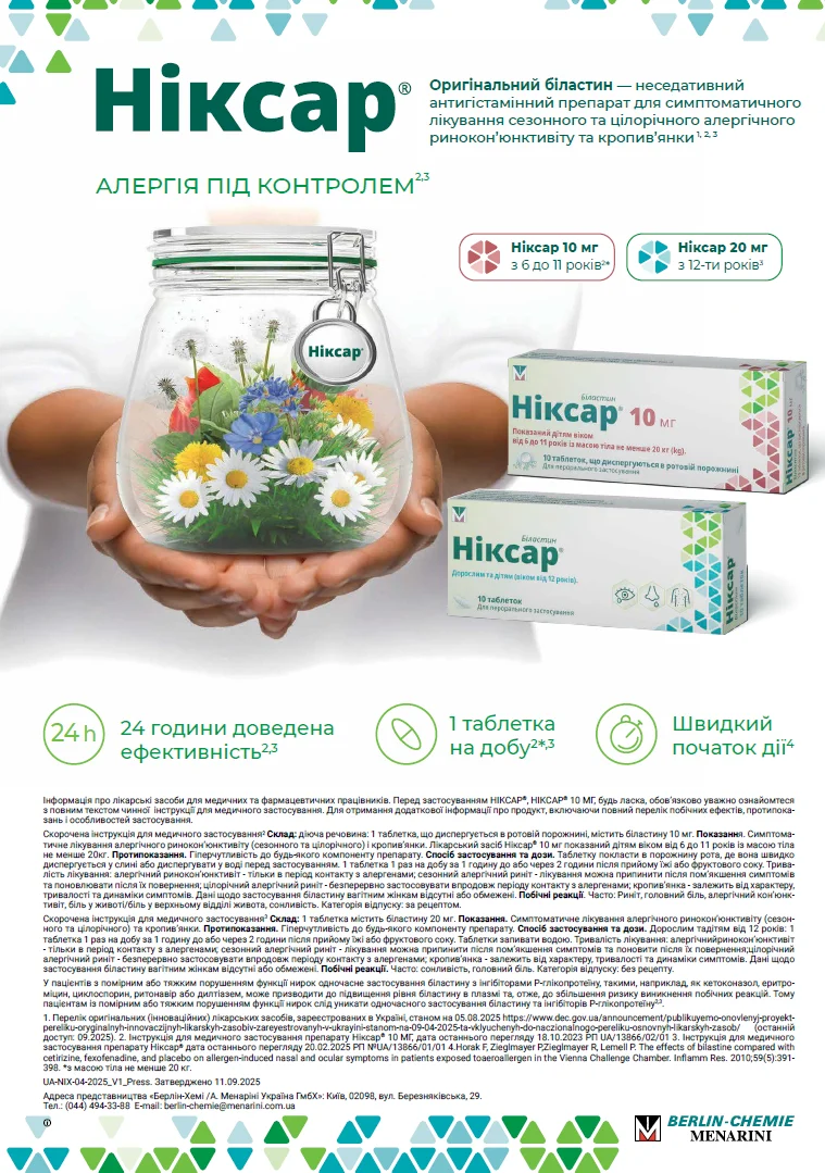 У цьому контексті на увагу заслуговує біластин (Ніксар®, «Берлін-Хемі») – антигістамінний препарат другого покоління, що поєднує клінічну ефективність з характеристиками, важливими для пацієнтоорієнтованого ведення АР. Біластин належить до неседативних H1-антигістамінних засобів і характеризується практично нульовою окупацією H1-рецепторів у головному мозку, що пояснює відсутність клінічно значущого седативного ефекту й мінімальний вплив на когнітивні та психомоторні функції. Це має не лише фармакологічне, а й глибоко практичне значення: пацієнт очікує від лікування не просто зменшення ринореї чи чхання, а збереження ясності мислення, звичної денної активності, працездатності та контролю над власним життям.