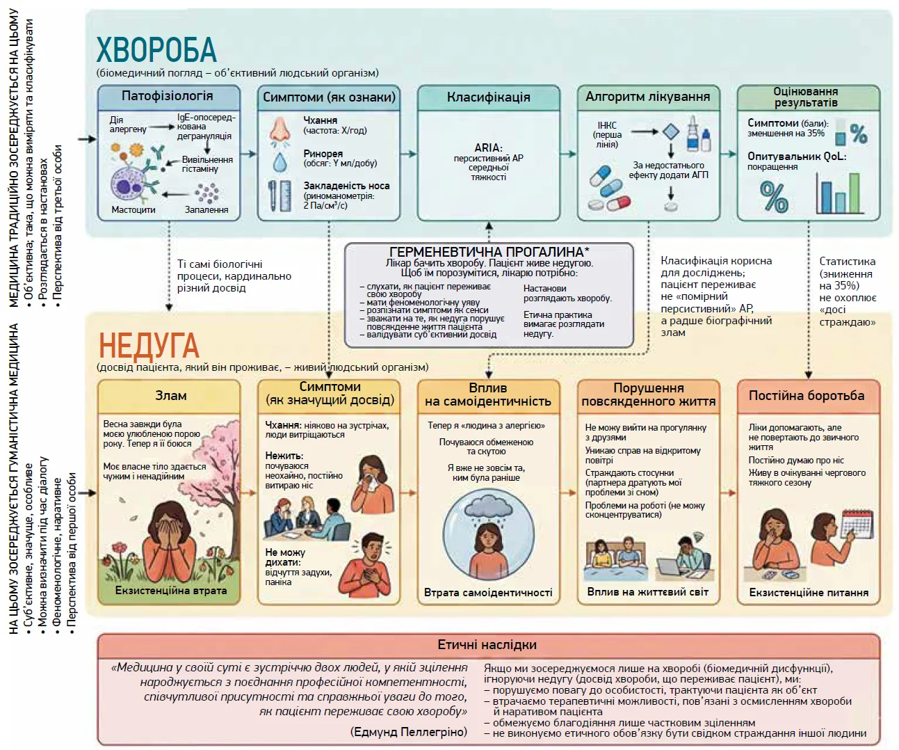 Розмежування між хворобою (англ. disease) як біомедичною сутністю та недугою (англ. illness) як індивідуально пережитим досвідом захворювання є особливо важливим у контексті АР (рис.). Підхід, зосереджений на хворобі як нозології, акцентує увагу на патофізіології, класифікації, терапевтичних алгоритмах і кількісно вимірюваних результатах. Натомість перспектива недуги дає змогу побачити суб’єктивний вимір стану пацієнта: яке значення він надає своїм симптомам, як вони впливають на його самоідентичність, повсякденну активність і якість життя [4].