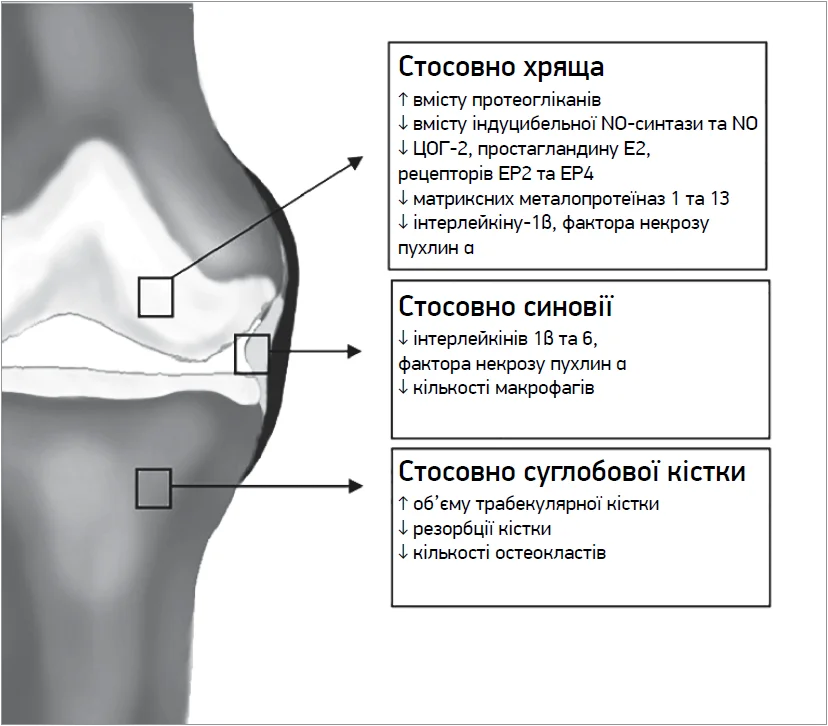 Під час проведення дослідження S. Cheleschi та співавт. (2021) in vitro виявлено, що глюкозаміну сульфат і целекоксиб чинять синергічну хондропротекторну, протизапальну, антиапоптичну й антиоксидантну дію (рис.).