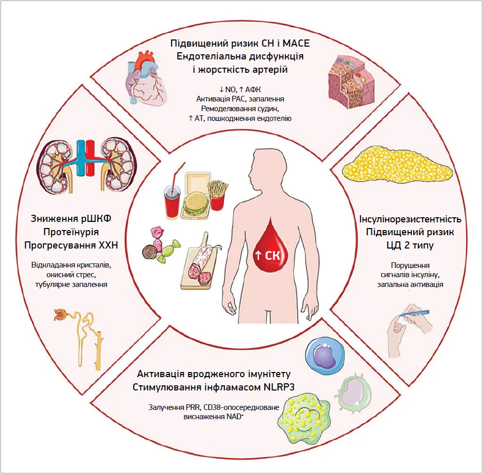 СК, яку довго вважали інертним кінцевим продуктом пуринового обміну, нині постає як активний чинник судинної патології. Її вплив виходить далеко за межі подагри: СК модулює запальні процеси, окисний стрес, порушення функції ендотелію та ремоделювання судинної стінки – ключові механізми в прогресуванні ССЗ [18].