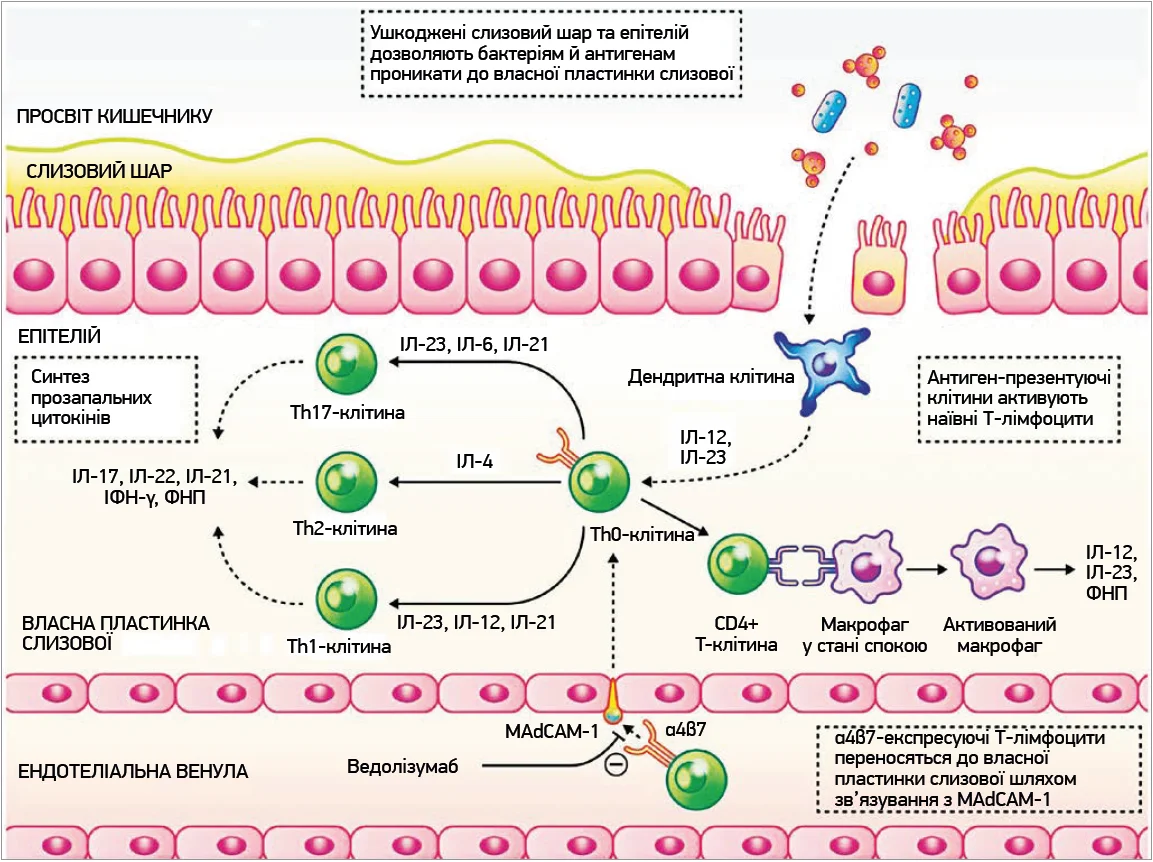 Шляхи, задіяні в міграцію лімфоцитів, патогенез ХК і механізми дії ведолізумабу, докладно описані іншими авторами [33, 34]. Ведолізумаб вибірково зв’язується з α4β7-інтегриновим гетеродимером, що експресується на Т-лімфоцитах, та запобігає його взаємодії з адгезивними молекулами адресину слизової оболонки кишечнику‑1 (MAdCAM‑1) на ендотеліальних клітинах кишечнику (рис. 1) [31, 32, 35].
