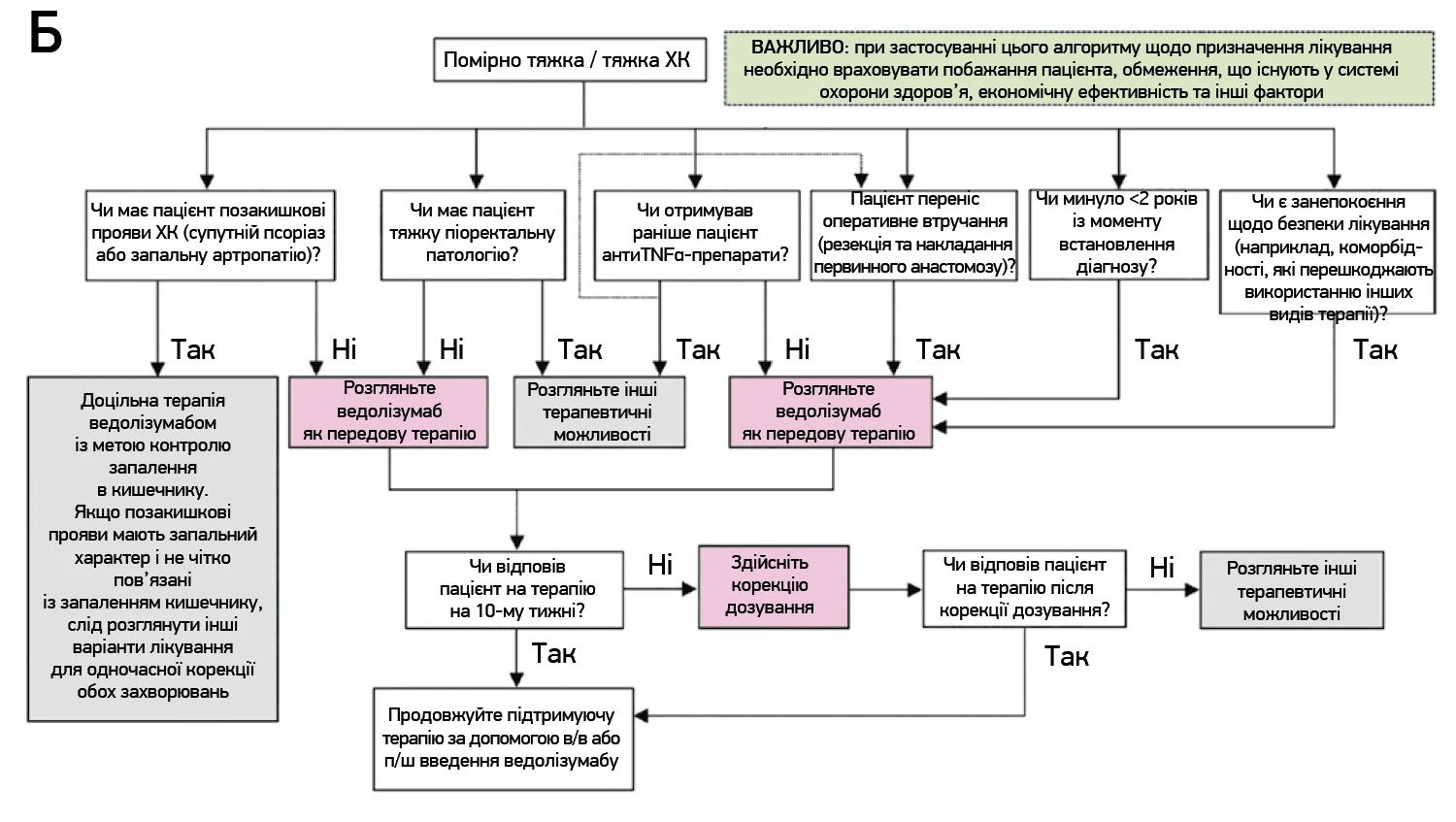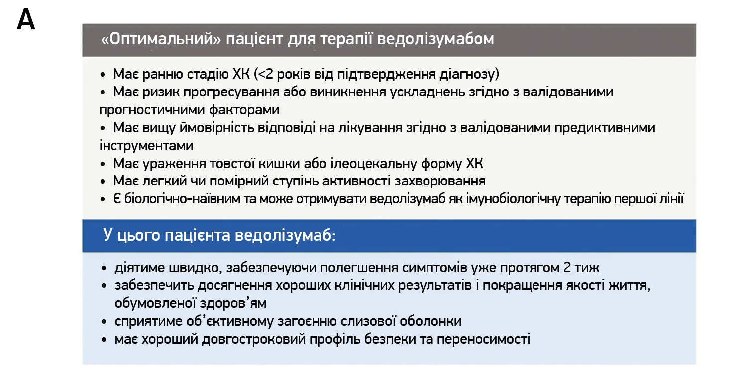 Рис. 2. Характеристика хворих на ХК, призначення яким ведолізумабу очікувано забезпечить оптимальний терапевтичний ефект (A), та алгоритм лікування ведолізумабом хворих на ХК (Б)