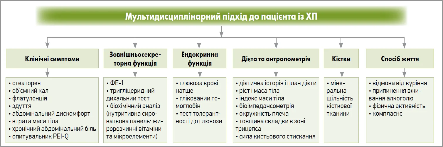 На завершення своєї доповіді професор Н. Б. Губергріц окреслила основні тези мультидисциплінарного підходу до ведення пацієнта із ХП. Вона звернула увагу на необхідність оцінки зовнішньосекреторної функції ПЗ, ендокринної функції, аналізу антропометричних даних, виміру мінеральної щільності кісткової тканини, а також зміни способу життя, але перше місце в цьому алгоритмі посідає оцінка клінічних симптомів пацієнта (рис.).