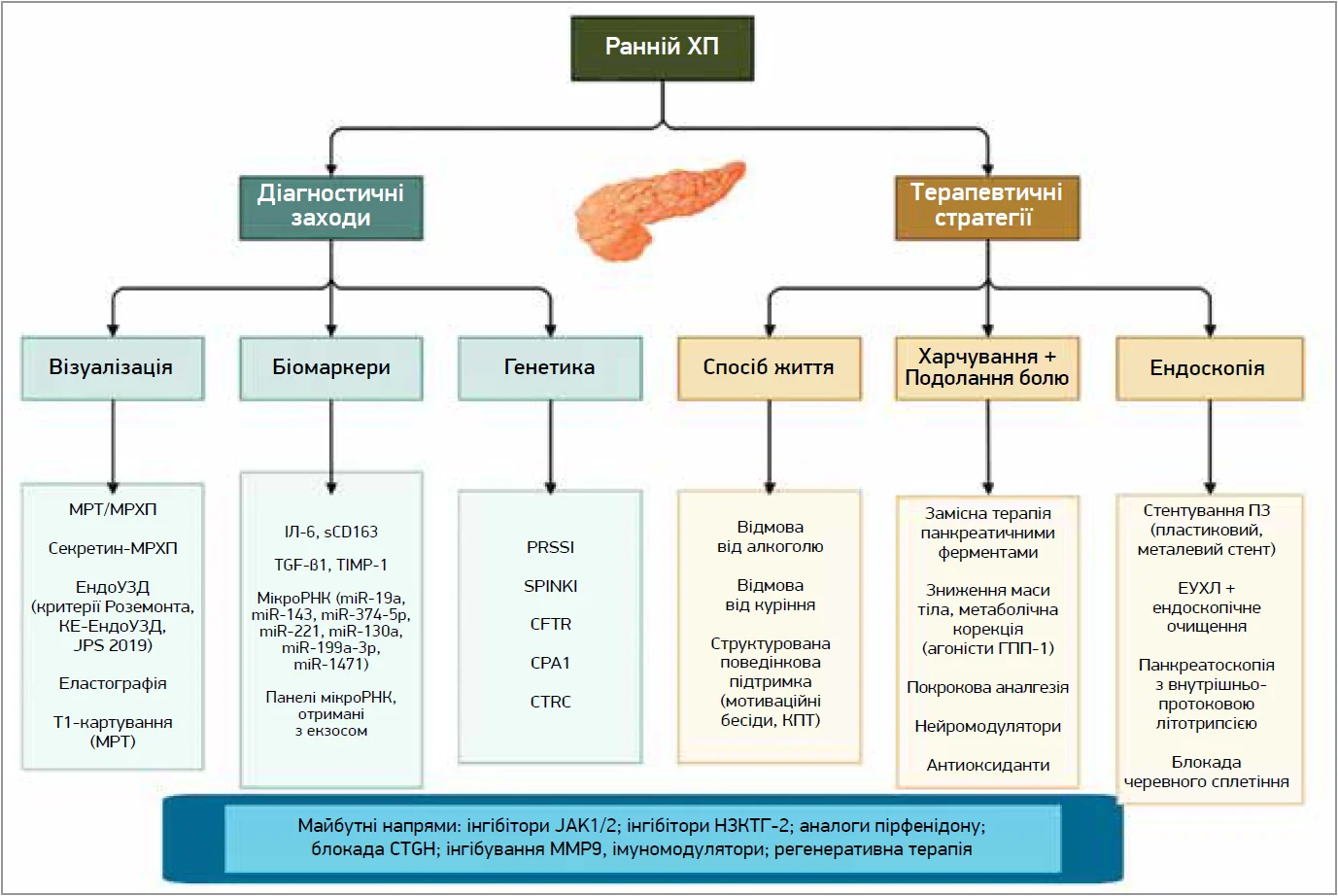 Рис. 1. Діагностичні підходи, терапевтичні стратегії та майбутні напрями в лікуванні раннього ХП