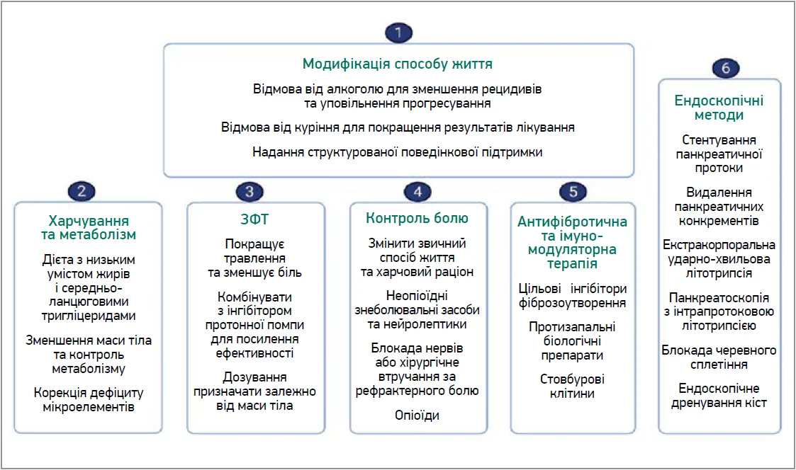 Комбіноване використання ЗФТ з одночасною корекцією раціону зменшує інтенсивність болю та рівні прозапальних біомаркерів (IЛ‑6, CРБ) краще, ніж застосування тільки дієти, що свідчить про потенційний протизапальний ефект ЗФТ [105]. Призначення ЗФТ хворим з ознаками екзокринної недостатності, діагностованої за даними візуалізаційних / функціональних досліджень, може покращити нутритивний статус і сповільнити структурне прогресування [106]. Дозування ЗФТ із розрахунку 500 Од ліпази/кг маси на прийом їжі асоціюється із кращим контролем мальабсорбції та симптомів. Спеціалізовані форми випуску ферментних препаратів (мікросфери з ентеросолюбильним покриттям) покращують прихильність пацієнтів до лікування та поліпшують гастроінтестинальну переносимість, зменшуючи частоту абдомінального дискомфорту і нудоти [107].