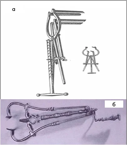 Рис. 1. Інструменти (а, б) античної Греції для огляду порожнин тіла людини [43]