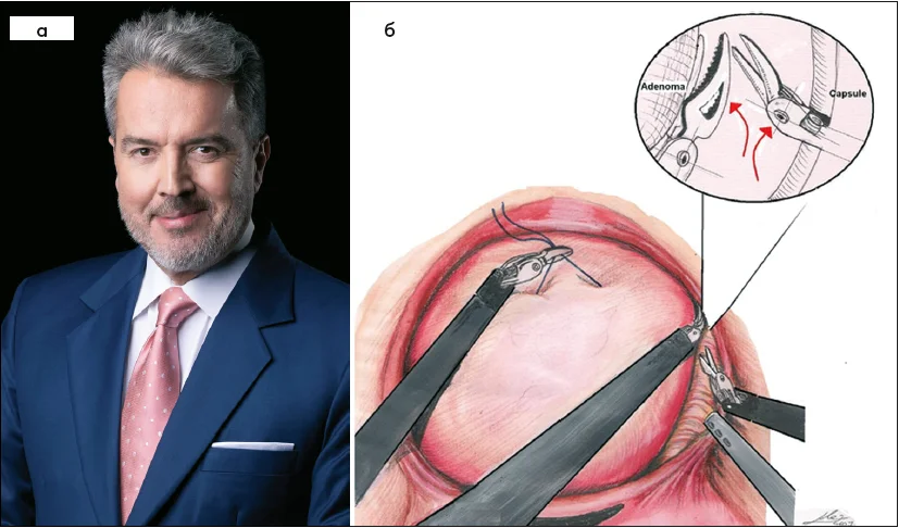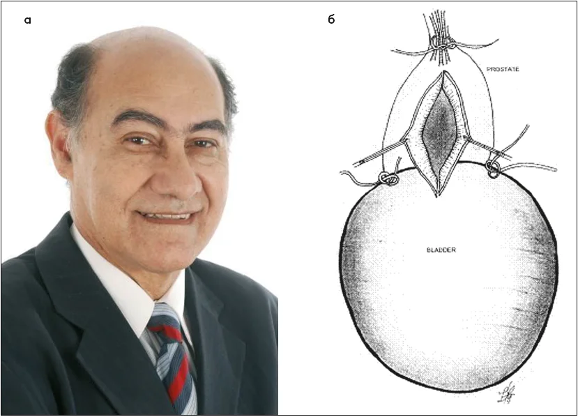 Рис. 16. Професор M.B. Mariano (Порту-Алегрі, Бразилія) та його рисунок з оригінальної роботи, що описує першу лапароскопічну simple-простатектомію (а) шляхом поздовжнього міхурово-капсулярного доступу з попереднім прошиванням «ніжок» простати (б) [30]