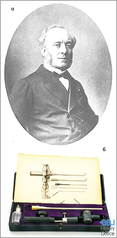 Рис. 3. A.J. Desormeaux (1815-1894) (а) та сконструйований ним ендоскоп (б) [21]