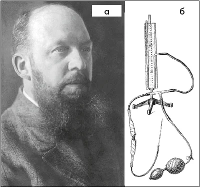Рис. 5. G. Kelling (1866-1945) (а) та впроваджений ним пристрій для нагнітання повітря у черевну порожнину (б) [22]