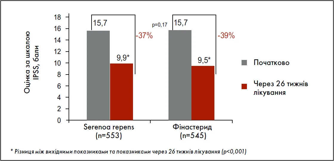 Рис. 1. Зміни абсолютної величини загальної оцінки за шкалою IPSS від вихідного рівня через 26 тижнів спостереження [26]