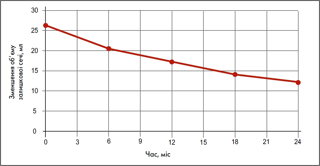 Рис. 4. Ефективність Простамол® Уно щодо зменшення об’єму залишкової сечі у 24-місячному клінічному дослідженні [27]