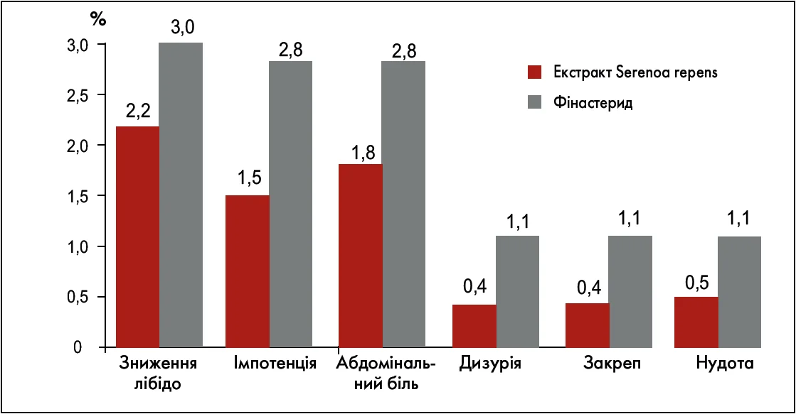 Порівняння профілів безпеки екстракту Serenoa repens та фінастериду також свідчить про суттєві переваги фітопрепарату: у групі фінастериду було більше повідомлень про дизуричні явища, закреп, нудоту, абдомінальний біль, зниження лібідо та імпотенцію, ніж у групі Serenoa repens [26] (рис. 5).