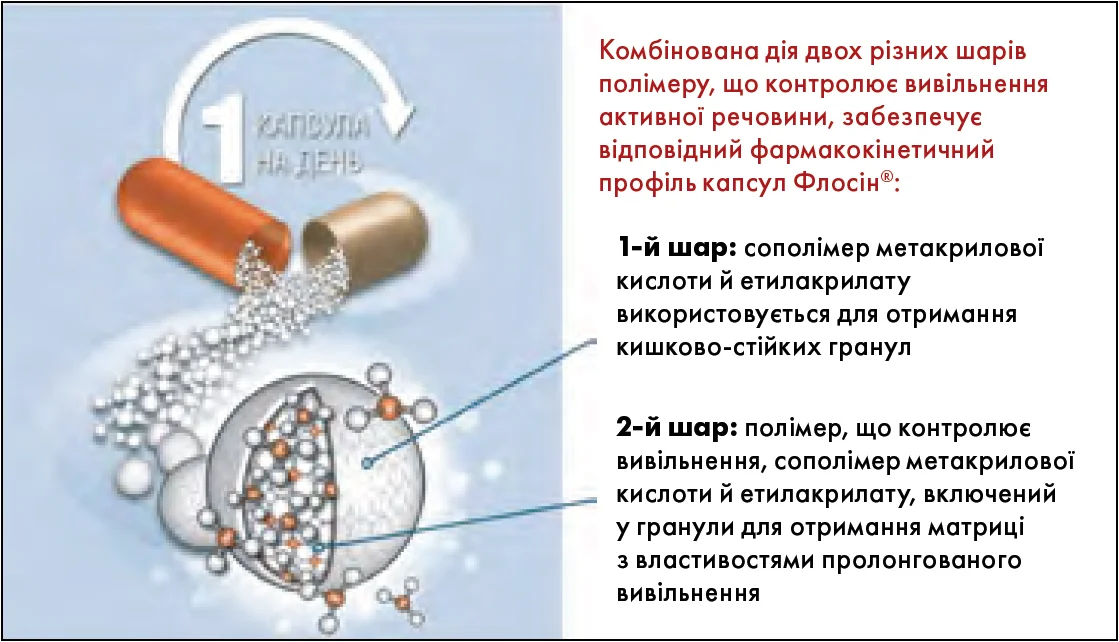 Флосін® вибірково та ефективно зв’язується з постсинаптичними α1A-адренорецепторами, знижуючи тонус гладкої мускулатури ПЗ та сечовивідного каналу. Як наслідок, препарат зменшує обструкцію сечовивідних шляхів, полегшуючи тим самим сечовипускання. Тамсулозин збільшує Qmax та покращує резервуарну функцію, яка часто порушена через нестабільність сечового міхура.