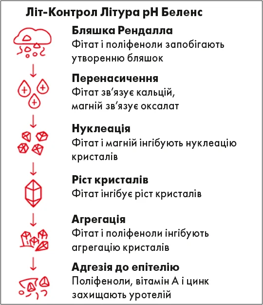 ! Усі компоненти є доведеними інгібіторами кристалізації оксалату кальцію, що впливають на весь шлях утворення оксалатних каменів у нирках починаючи з формування бляшок Рендалла (зародження кристалів):