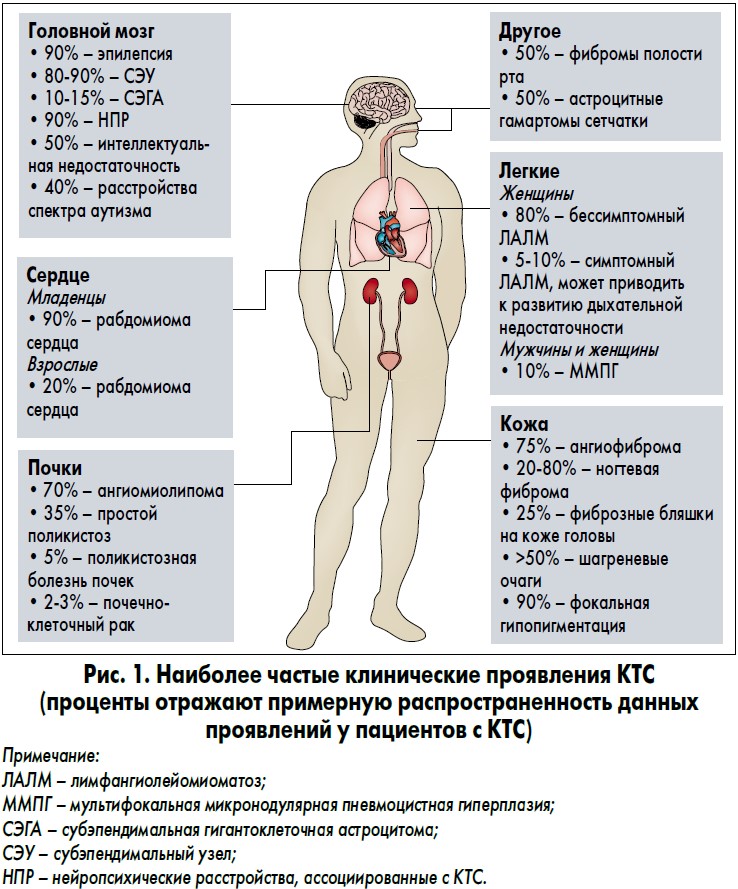 Нейропсихические расстройства, ассоциированные с КТС. Интеллектуальная недостаточность, расстройства спектра аутизма и психические нарушения у лиц с КТС часто остаются гиподиагностированными и недостаточно скорректированными. В соответствии с рекомендациями Консенсусной конференции 2012 г. дети с КТС должны проходить тщательное нейропсихологическое обследование на момент установления данного диагноза, а также находиться под пристальным последующим наблюдением невролога и психиатра в детском и подростковом возрасте. Поскольку различные типы эпилепсии, в частности младенческие судороги и рефрактерная эпилепсия, являются факторами риска развития когнитивных нарушений и расстройств спектра аутизма при КТС, должно проводиться агрессивное лечение эпилепсии с целью достижения адекватного контроля судорожной активности.