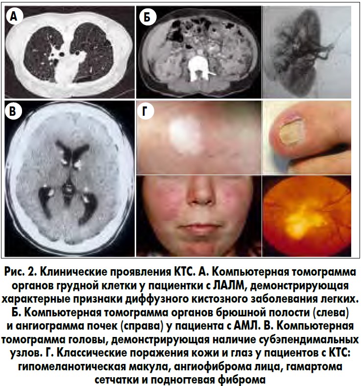 КТС имеет характерные клинические проявления, включающие мальформации церебральной коры (туберсы), рабдомиомы сердца, которые могут формироваться в периоде внутриутробного развития и обычно регрессируют в раннем детстве, почечные ангиомиолипомы (АМЛ), содержащие аневризматические сосудистые структуры опухолевого происхождения, ангиофибромы лица (доброкачественные опухоли на лице, состоящие из заполненных кровью сосудов), гипомеланотические макулы (белые очаги на коже) и легочный лимфангиолейомиоматоз (ЛАЛМ) – деструктивное заболевание легких, развивающееся почти исключительно у женщин (рис. 2). У педиатрических пациентов с КТС часто отмечаются младенческие судороги и расстройства спектра аутизма.