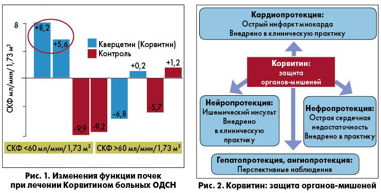 Еще один препарат, который показал свою эффективность у пациентов с ОДСН, – это кверцетин. Естественный биофлавоноид, широко распространенный в природе, уже достаточно давно (с конца 40-х гг. XX века) применяется для улучшения микроциркуляции при различных состояниях. Учитывая полученные в 90-е гг. результаты коллективом ученых НАНУ, АМНУ с участием Борщаговского ХФЗ и отдела реанимации и интенсивной терапии Института кардиологии им. Н. Д. Стражеско НАМН Украины, была разработана новая внутривенная форма этого липофильного лекарственного средства, которая получила патентованное название Корвитин.