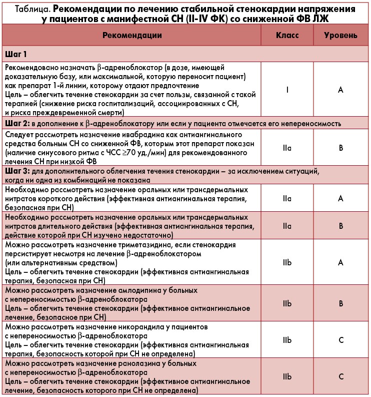 Одним из медикаментов с доказанной эффективностью при СН на фоне ИБС и ХСН является триметазидин. Данный препарат существует давно, было проведено большое количество различных исследований, которые подтверждают его эффективность и безопасность у пациентов с СН. Триметазидин внесен в европейские и украинские рекомендации по лечению пациентов с СН (2016), представленные в таблице.