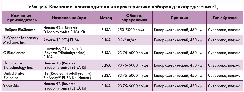 Для прямого количественного определения rT3 в сыворотке человека используется иммуноферментный анализ (принцип ELISA, Enzyme-Linked Immunosorbent Assay). Общее время выполнения теста – в среднем 2,5 ч. Компаниипроизводители и характеристика наборов для определения rT3 представлены в таблице 4.