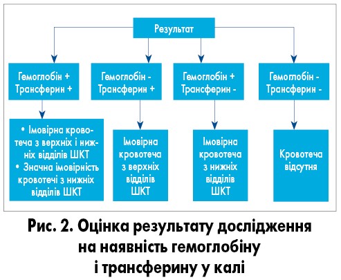 Позитивний результат дослідження на вміст гемоглобіну та трансферину у калі свідчить про наявність кровотечі з верхніх та нижніх відділів ШКТ і значну імовірність кровотечі саме з нижніх відділів. При негативному результаті на наявність гемоглобіну та позитивному – на наявність трансферину діагностується кровотеча з верхніх відділів ШКТ, при позитивному результаті тесту на гемоглобін та негативному на трансферин – кровотеча з нижніх відділів ШКТ. Відсутність гемоглобіну та трансферину у калі означає, що кровотеча відсутня (рис. 2).