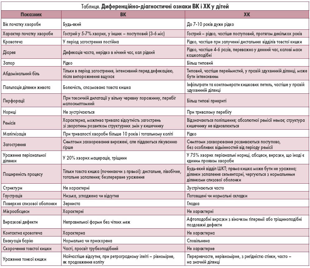 Основні диференційно-діагностичні ознаки ВК і ХК у дітей представлені у таблиці 1.