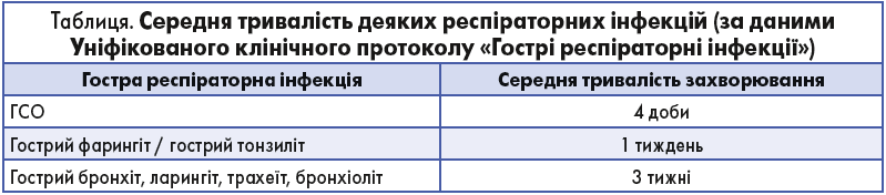 Необхідно зазначити, що дуже важливим питанням у менеджменті запальних захворювань ЛОР-органів має оптимальна тривалість прийому НПЗП, що є необхідною умовою для досягнення адекватних протизапального і знеболювального ефектів. Необхідність курсового прийому НПЗП патогенетично обґрунтована. Як відомо, виділяють три стадії запалення – альтерація, ексудація і проліферація. У разі запальних захворювань ЛОР-органів стадія альтерації – це приблизно перші 1-2 дні захворювання, коли на клітинному рівні відбувається пошкодження мітохондрій і лізосом, розвиваються гіпоксія та ацидоз. Друга стадія – ексудація – це приблизно 2-3-й день захворювання, коли внаслідок збільшення проникності судинної стінки відбувається вихід рідкої частини крові, електролітів і білків у тканини, що призводить до набряку слизових оболонок. Третя стадія – 4-5-й день – проліферація під час якої, завдяки активності фібробластів відбувається відновлення структури тканин. Середня тривалість деяких гострих респіраторних інфекцій наведена в таблиці.