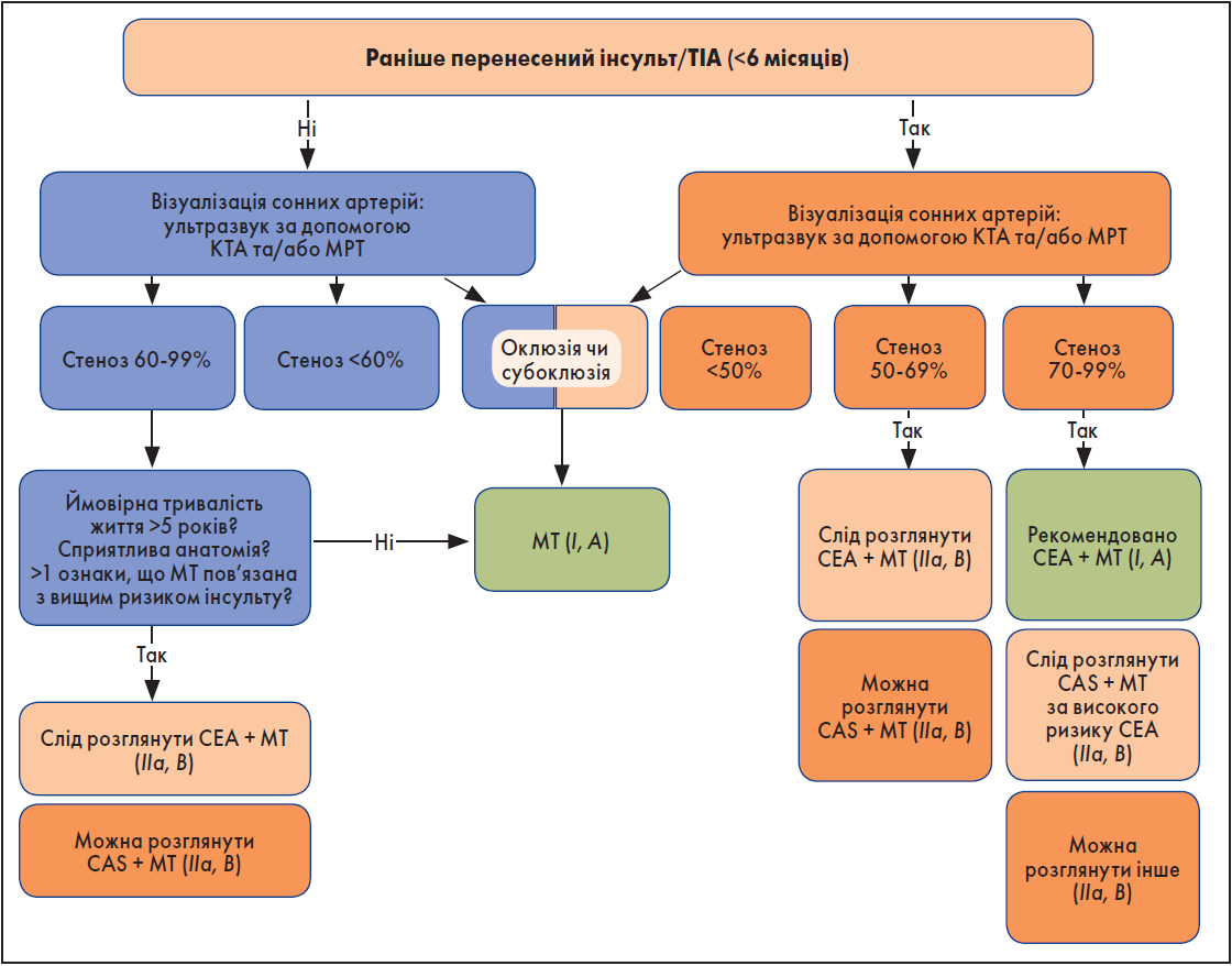 Рисунок. Менеджмент пацієнтів зі стенозом сонних артерій згідно з ESC та ESVS (2017)