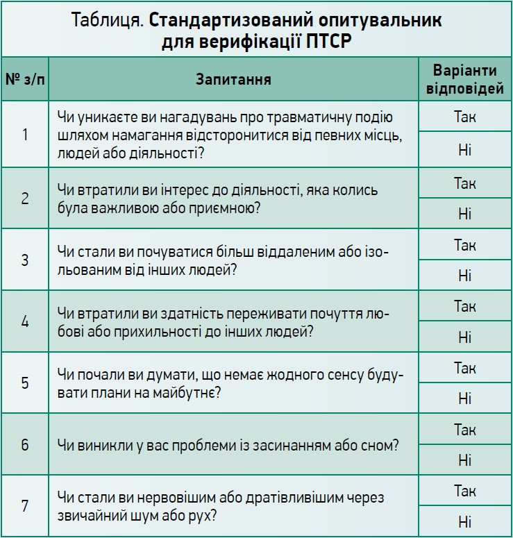 На другому етапі за наявності окремих симптомів для верифікації ПТСР у пацієнтів групи ризику використовуємо стандартизований опитувальник, який містить 7 запитань. Позитивна відповідь на ≥4 запитань свідчить про ймовірність наявності ПТСР (табл.).