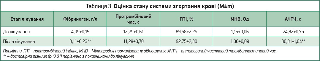 Середній термін перебування пацієнтів у стаціонарі, яким призначалася синдромно-патогенетична інфузійна терапія, становив 10,06±0,23 доби. Результати терапії лонгковідних пацієнтів до і після синдромно-патогенетичного лікування за клінічним аналізом крові та лейкоцитарною формулою представлено в таблиці 2, стан системи гемостазу згідно з даними коагулограми наведено в таблиці 3.