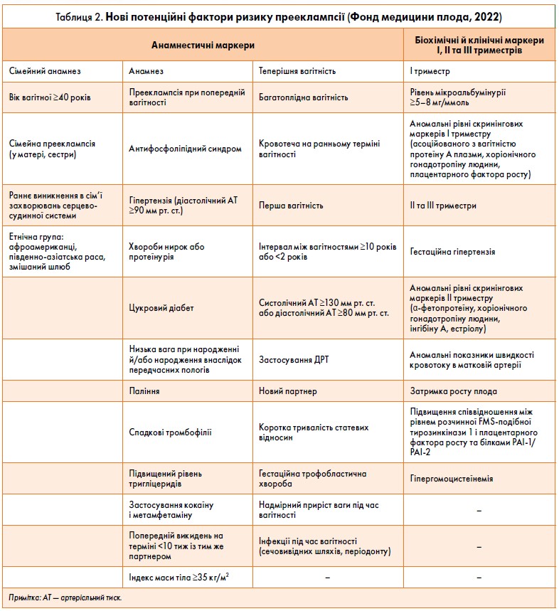 Виділяють дуже багато факторів ризику, які призводять до виникнення прееклампсії. До групи ризику належать жінки з хоча б одним фактором високого ризику (цукровий діабет 1‑го або 2‑го типу, хронічна гіпертензія, гіпертензивні розлади під час попередньої(іх) вагітності(ей), хронічна хвороба нирок, автоімунне захворювання, багатоплідна вагітність унаслідок застосування допоміжних репродуктивних технологій [ДРТ], ДРТ із донорськими яйцеклітинами) або принаймні з двома факторами помірного ризику (перша вагітність, вік вагітної >40 років, інтервал між вагітностями >10 років, індекс маси тіла ≥35 кг/м2 при першому зверненні до жіночої консультації, прееклампсія у сімейному анамнезі, спонтанна багатоплідна вагітність). Оцінюючи такий фактор, як хронічна гіпертензія, слід враховувати її множинні вторинні причини, зокрема паренхіматозні й судинні захворювання нирок, синдром обструктивного апное сну, коарктацію аорти, застосування медичних препаратів, первинний альдостеронізм, гіпертиреоїдизм, гіперкальціємію будь-якого генезу. З удосконаленням діагностики протягом останніх років вчені виділили нові фактори ризику прееклампсії (табл. 2).