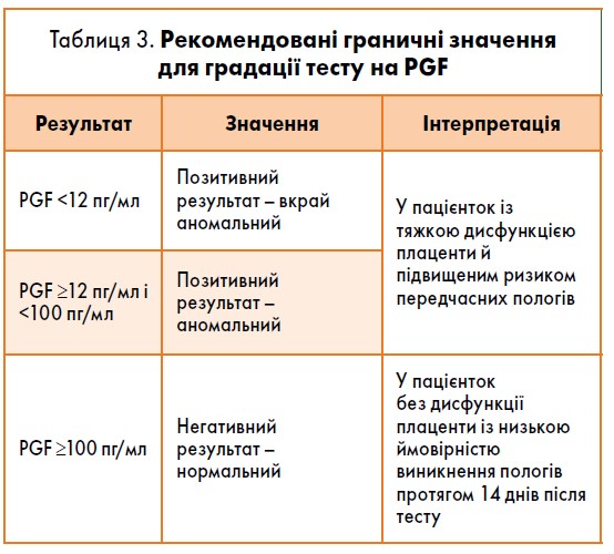У ІІ та ІІІ триместрах, тобто між 20‑м і 35‑м тижнями вагітності, у жінок із групи високого ризику визначають співвідношення між рівнем розчинної FMS-подібної тирозинкінази 1 і плацентарного фактора росту (sFlt‑1/PGF) або рівень плацентарного фактора росту (PGF). У пацієнток із хронічною гіпертензією доцільно визначити рівень PGF, щоб виключити подальші гестаційні ризики (табл. 3).